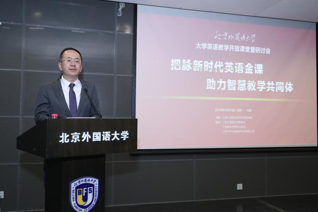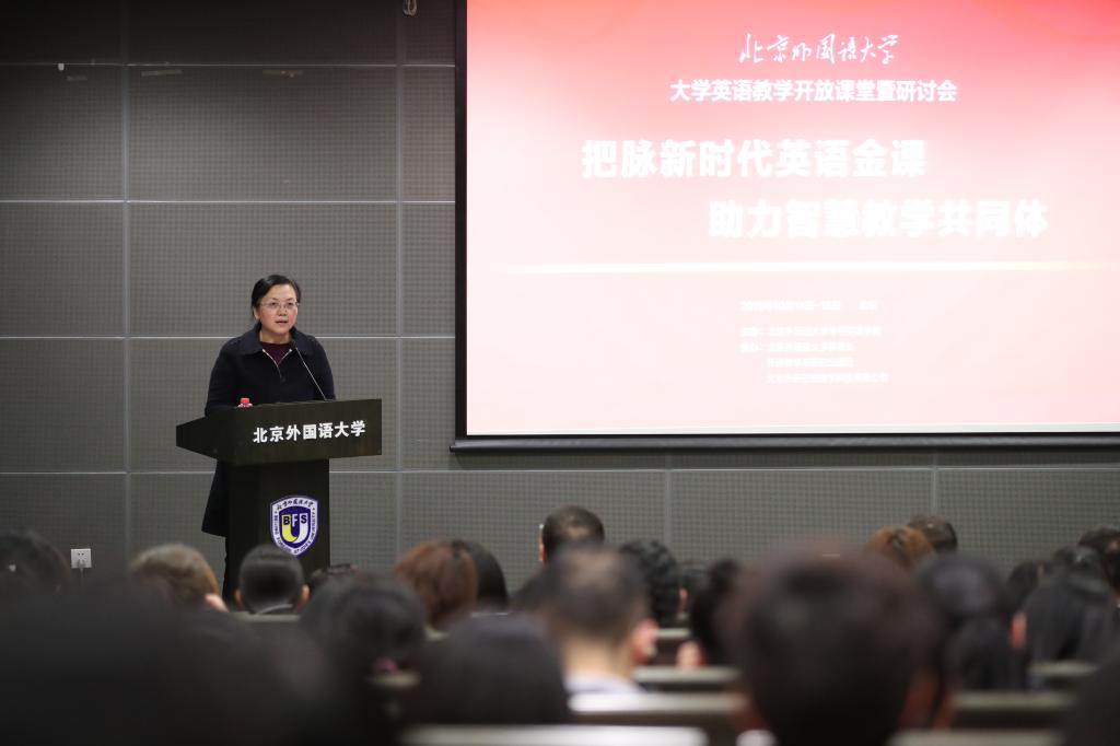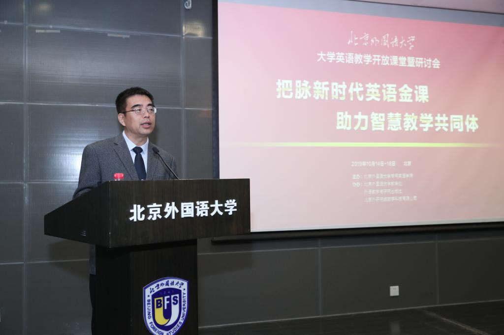 贾文键副校长首先代表王定华书记和杨丹校长欢迎与会教师,再次强调了新形势下大学英语课程的重要性及教学改革的紧迫性,指出本次教学开放课堂暨研讨会是首次聚焦大学英语课堂,是北外深化外语教学改革和外语教育内涵式发展,创建“一流”外语类高校、主动对接国家战略、培养国际化人才的体现,也是推动线上平台的教学创新,外语教师探索混合教学型“金课”的新阵地。他期冀全体参会教师在本届开放周中交流共享、协同发展、共同提高。