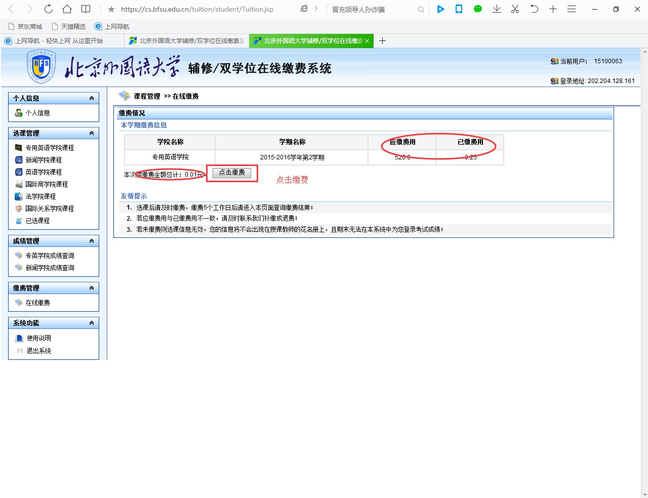 同学们在交纳学费前,请务必确认本人已选课程信息及对应应收款金额,如有疑问请将问题发往计算机系梁野老师邮箱:liangye@bfsu.edu.cn。