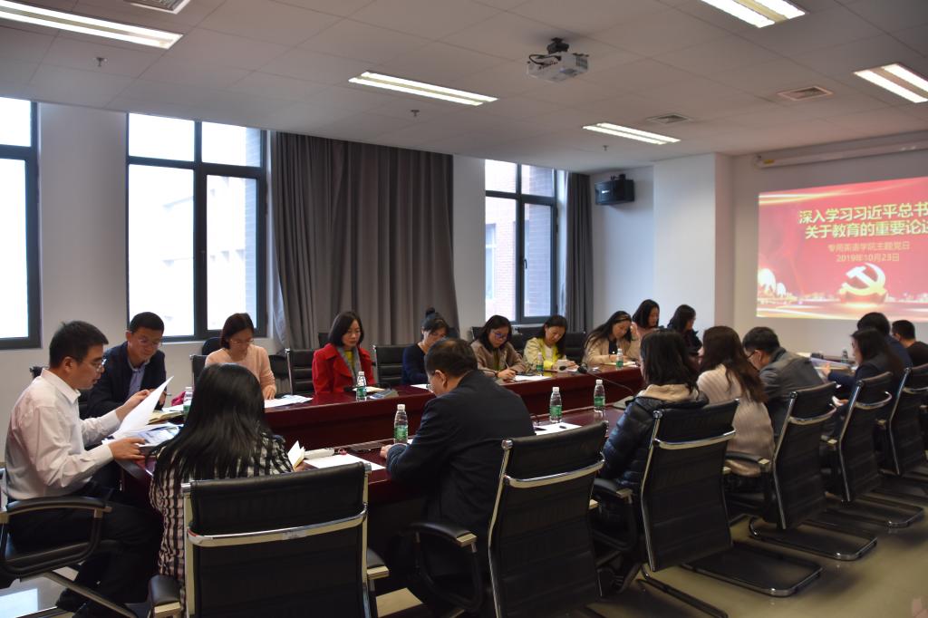 为深入贯彻落实学校“不忘初心、牢记使命”主题教育活动要求,beat365唯一官方网站直属党支部10月23日下午1:20在国际大厦1016会议室举行主题党日活动,召开“深入学习习近平总书记关于教育的重要论述”学习交流会。学校主题教育第三督导组督导、离退休党总支副书记刘刚、学院“双带头人”教师党支部书记工作室负责人李莉文、直属支部书记仵胜奇、副书记蔡鸿、支部委员蒋岳春、匡琳琳 以及全体党员19人参加。交流会由蔡鸿主持。